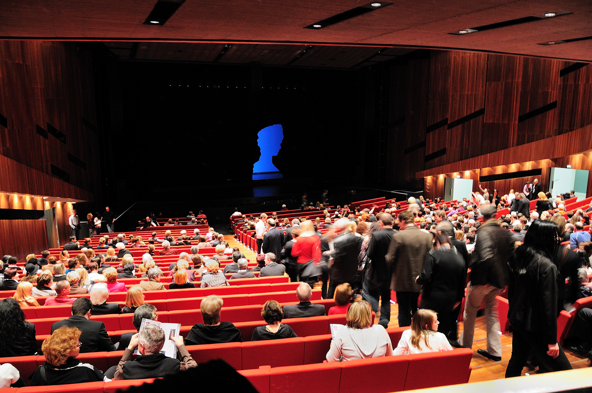 The Großer Saal (great hall), combining dark acacia wood with red upholstered seating, exudes a warm, inviting atmosphere. Boasting one of the largest revolving stages in Europe and equipped with the full range of facilities for theatre, concerts and opera, the auditorium is a popular venue for cultural events.