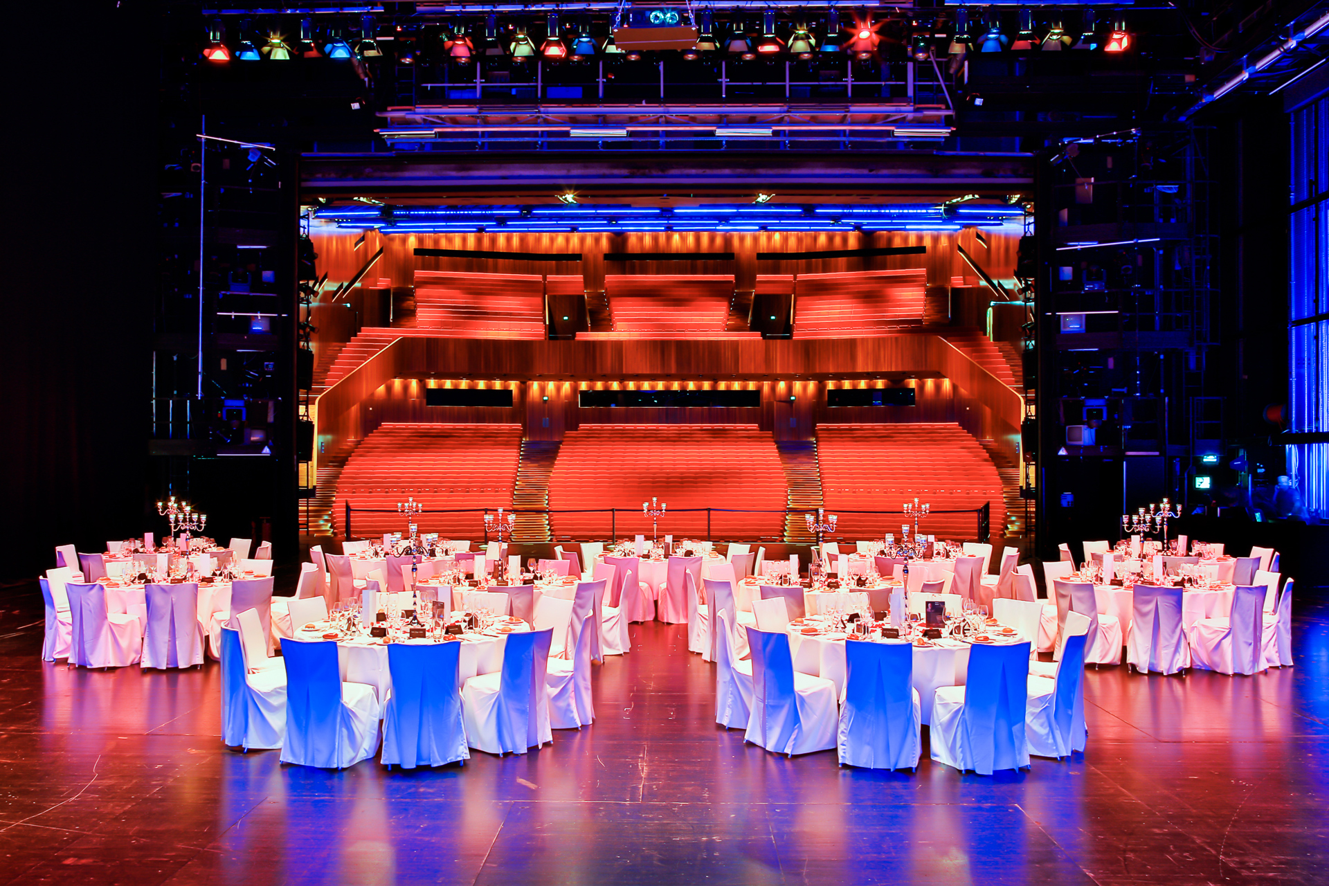 The combination of the Großer Saal, with Vor,- Hinter- und Seitenbühnen allows for highly flexible spatial concepts and bespoke settings – ideal for conferences, corporate events, gala dinners, or high-end networking events. An event launch, for instance, can be dramatically choreographed via a targeted curtain reveal in the Hauptbühne. A technical highlight is the 20-metre diameter revolving stage, offering dynamic spatial movement and ever-changing perspectives – even in real time during live events. Equally compelling is the view into the fly loft and stage tower, which can be custom-lit to reflect your corporate identity or desired ambience. The mobile orchestra shell can be employed either as an integral stage element or as a decorative feature to enhance the overall visual composition.