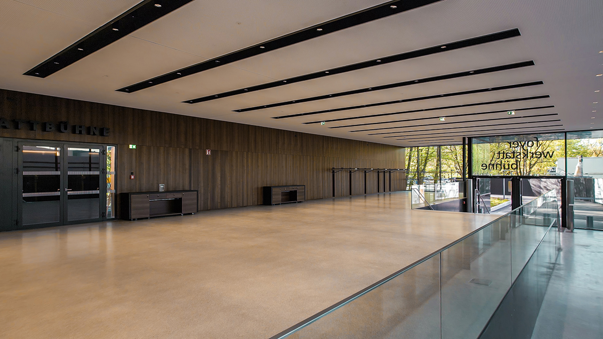 The 360° image of Foyer 1 gives a panoramic look toward the entrance of the Parkstudio and Saal Propter Homines, as well as down the main staircase into the Eingangsfoyer.
