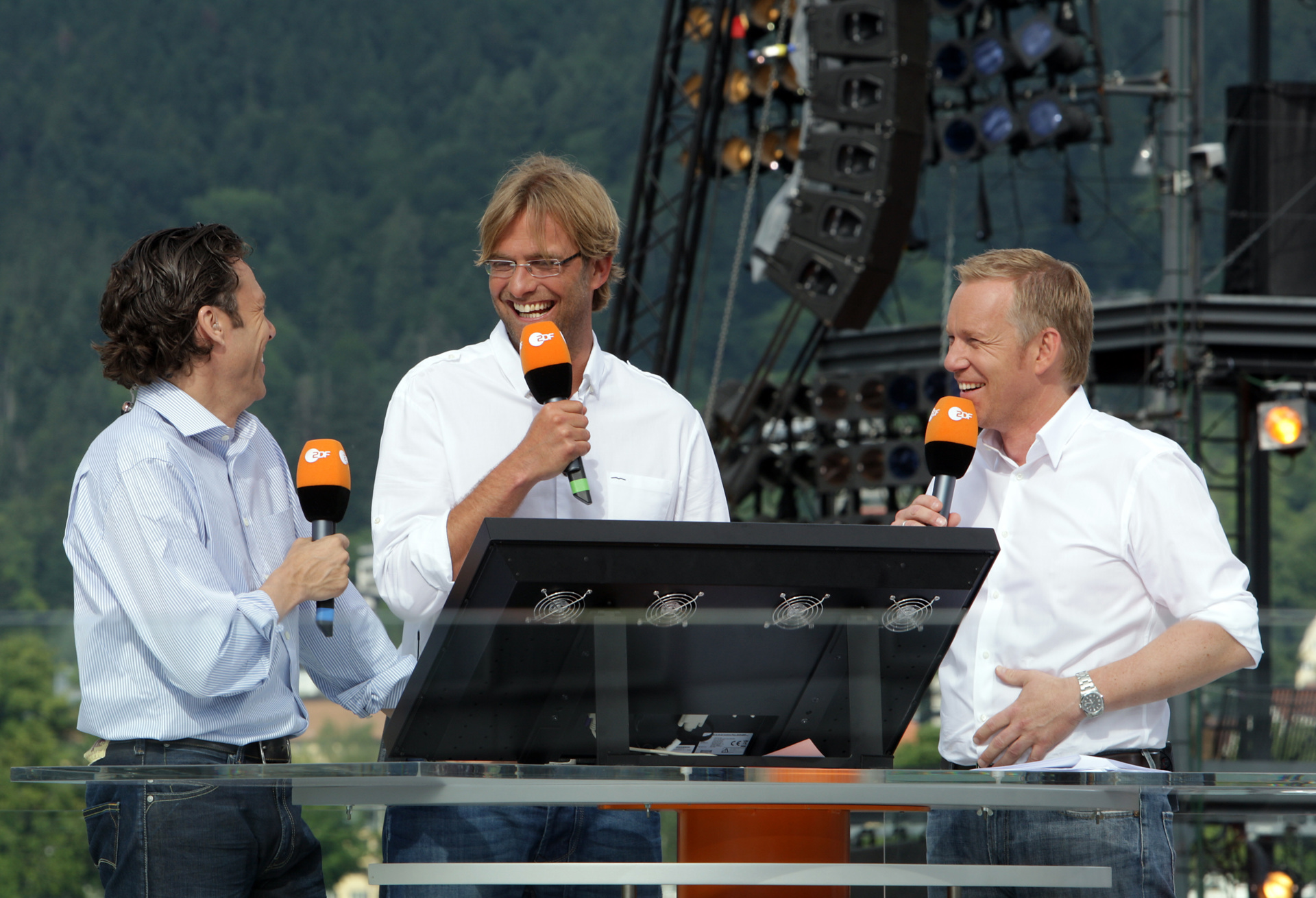 "In terms of technology, nothing we had experienced before was on the scale of that event," Köppl says. The control centre inside the Festspielhaus had to ensure the smooth functioning of transmission from the beginning to the end of the championships. The television channel broadcasting from the Festspielhaus, Germany's ZDF, transferred a huge amount of its equipment from its Mainz headquarters to Bregenz – cables were laid with a total length of 600 kilometres. Meetings involving dozens of specialists had to be held every day. The Festspielhaus was temporarily repurposed, inside and out, to allow for broadcasting and even playing football – fenced-in pitches and penalty practice areas appeared on the Platz der Wiener Symphoniker in front of the complex. The ZDF mascot, the Mainzelmännchen, popped up all over the place, and in the Werkstattbühne there was a permanent exhibition entitled "The Miracle of Bregenz". The platform of the lake stage was converted into a TV studio, acquiring that appearance which will probably stick in the minds of ZDF viewers and public viewing (Seetribühne) audience members for ever.